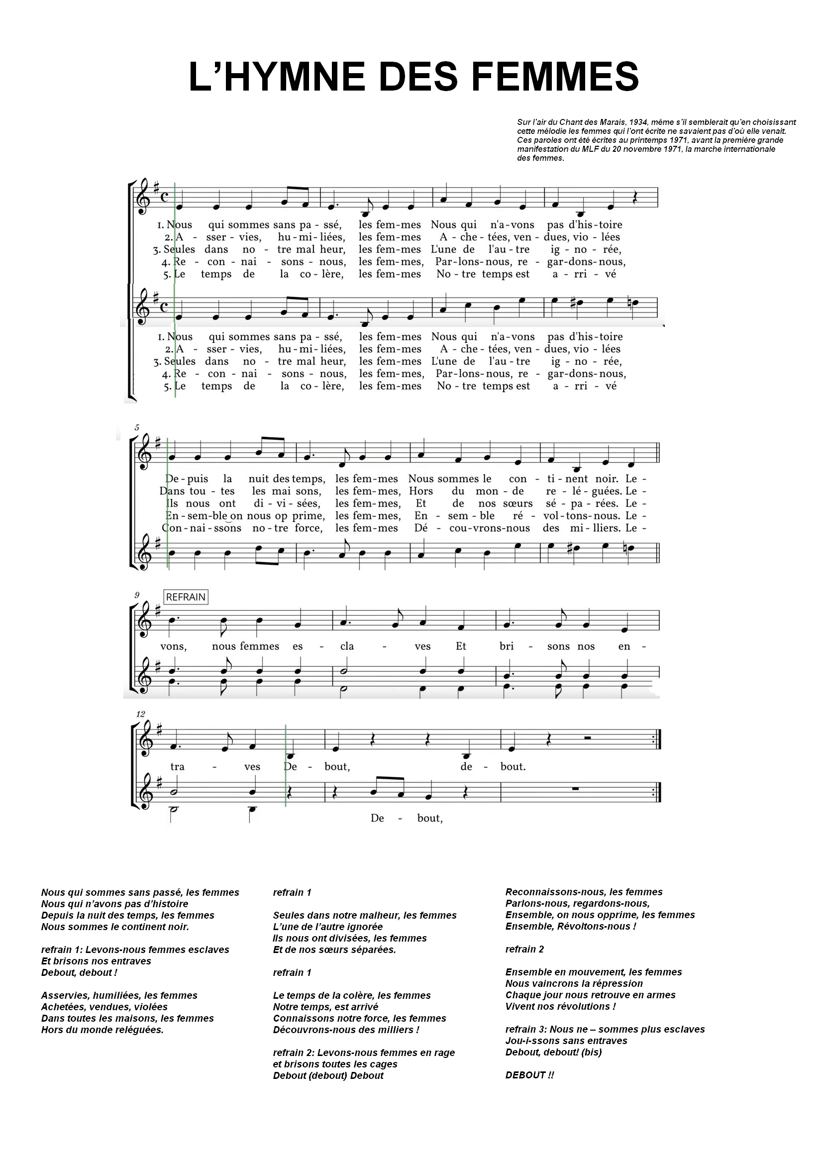 Hymne des femmes ²⁰²⁵ < retour au sommaire Chantée par Espèce de chorale ParolesTélécharger Partition et parolesTélécharger Voix TuttiTélécharger